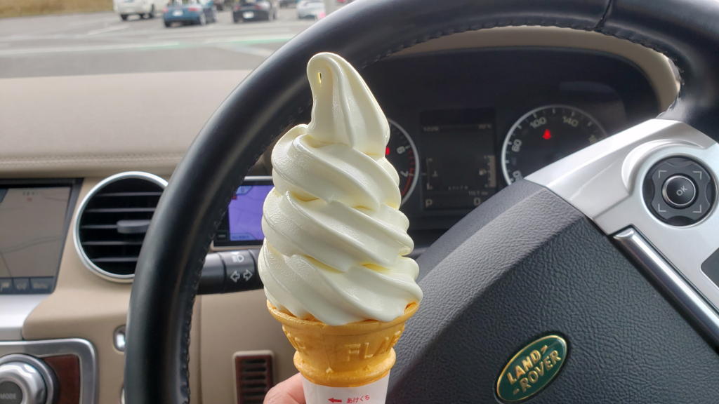 ドアを開けてからちょっと慌てた。D4車内に入った際に、まずは除菌ジェルで手をゴシゴシするのが習慣化しているのだが、ソフトクリームを手に持っているのでそれが出来ない。