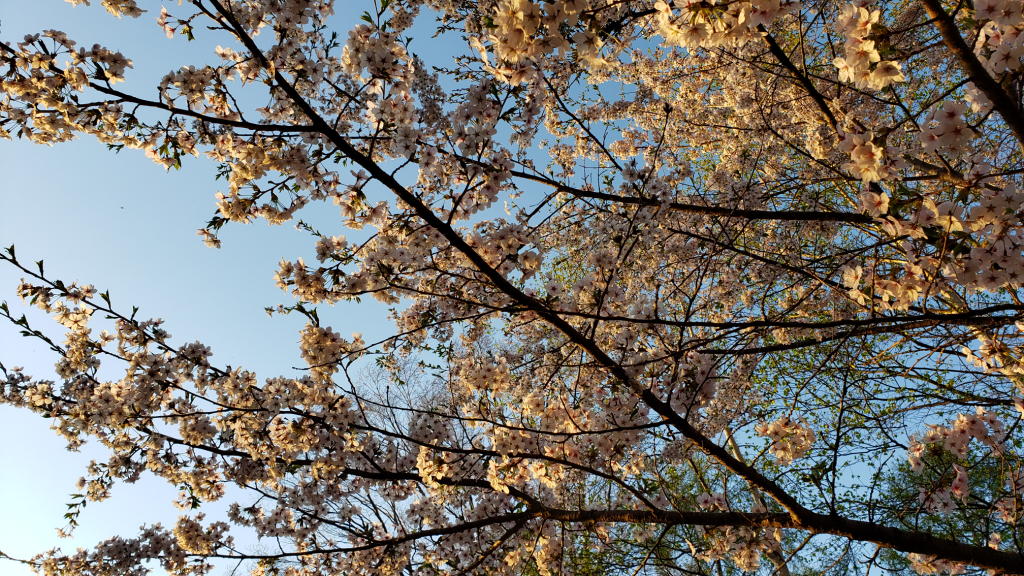 午後6時過ぎに再びソメイヨシノを愛でに行く。夕陽に照らされた桜は妖艶さを増す。