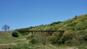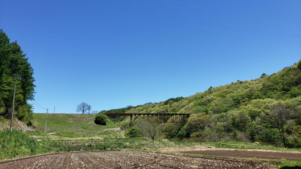 買い物の帰りに立沢川橋梁の脇の道を通った。冬の間は寒々しい朽ちたイメージしかなかった「旧立場川橋梁」の鉄錆の色が新緑に映えて、妙に美しく思えた。思わずD4を道路脇に駐車して写真撮影。