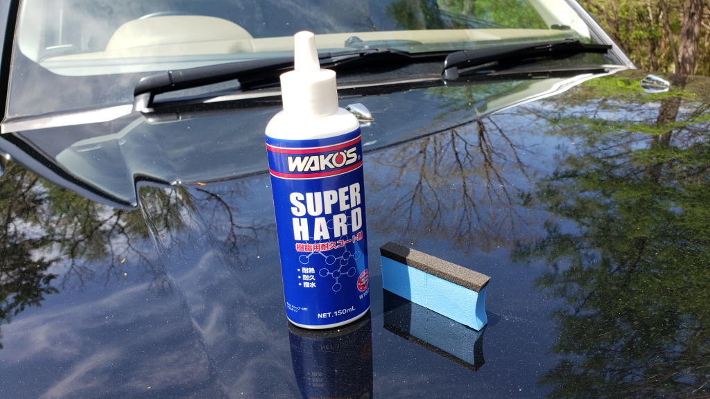 使用するコーティング剤は、車好きにはおそらく超有名な「WAKO’S(和光ケミカル) SUPER HARD」だ。前車ランクル100の頃からの長い付き合いで、樹脂パーツの耐久コート剤でこれを上回るものは無いと思う。あの見窄らしい「白ボケ」を見事に防いでくれるのだ!