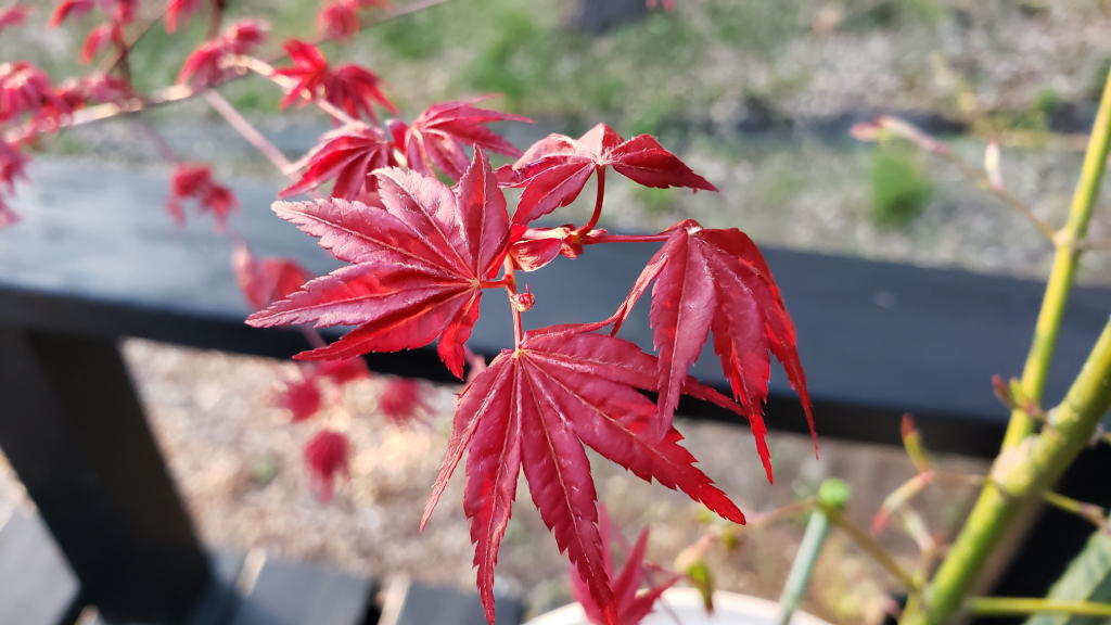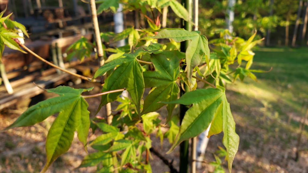 リハビリ中の4種類のカエデが、まるで競争するかのように葉を開き始めていた。