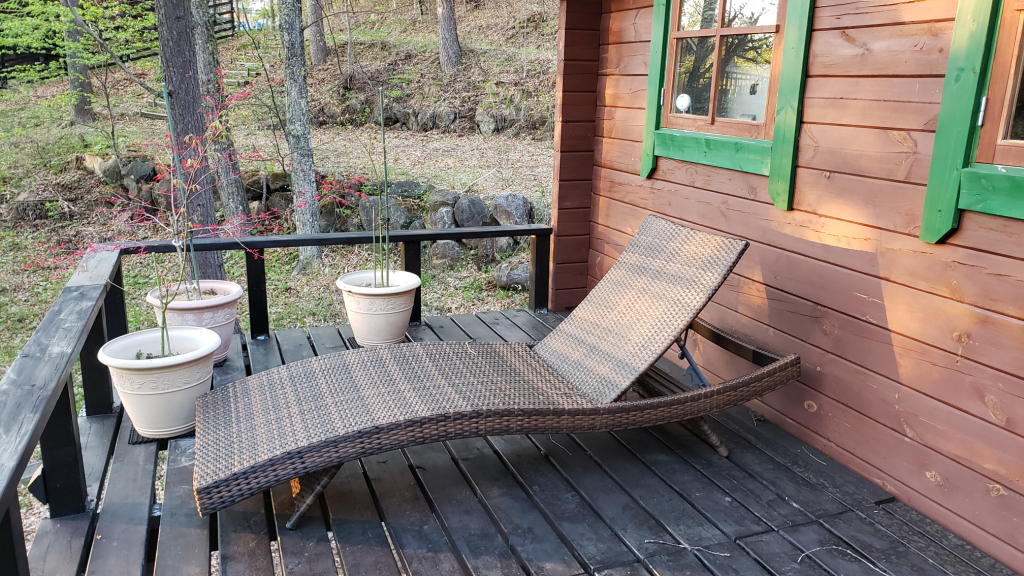 夕陽を眺めようとオフィスウッドデッキに置いた1号ガーデンベッドに寝そべった。