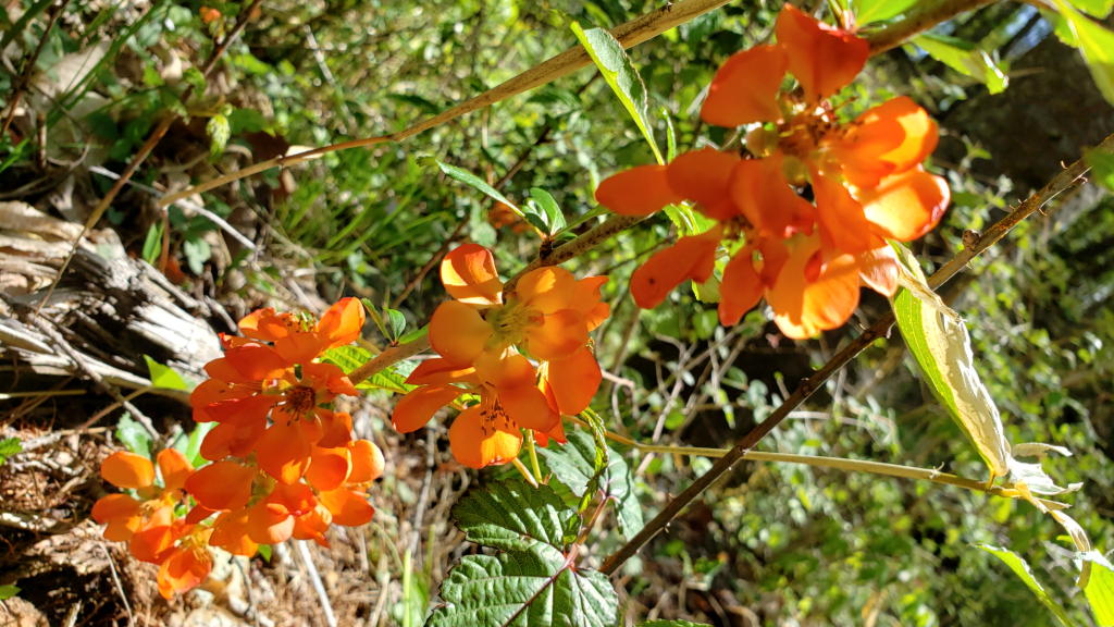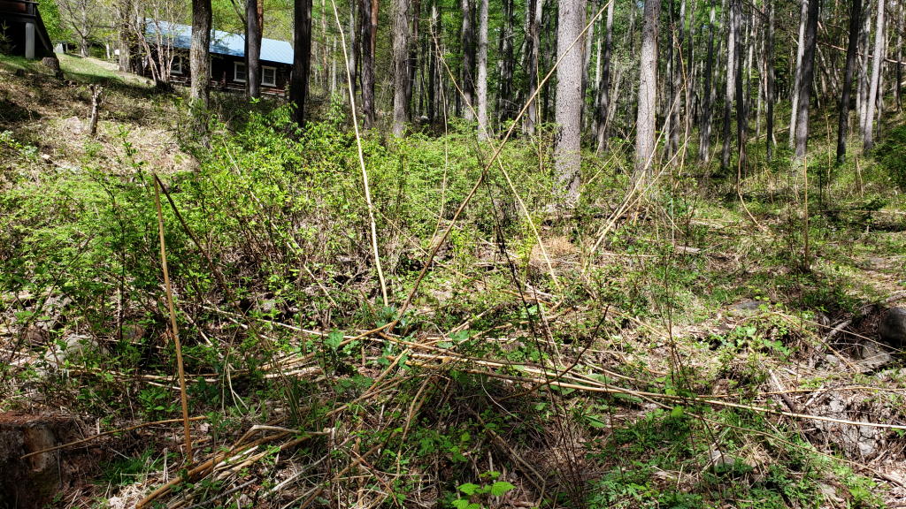 草を刈り取ったエリアの先端部分には、クサボケやイカリソウが群生する私のお気に入りの場所があり、その先は涸れ沢となっている。夏から秋にかけてはタケニグサに完全に覆われてしまうエリアだが、今年は何とかこの部分だけには繁茂させないようにしようと改めて決意!