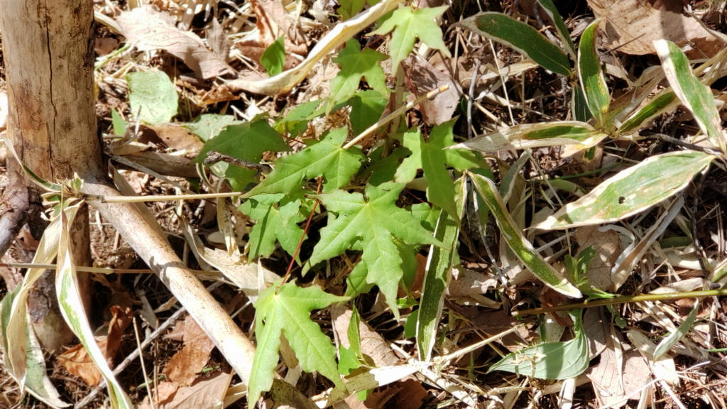1時間15分程で財産区林の下草刈りは終わったが、まだ草刈機の燃料があった、そこでさらに10分程、我が家の敷地内の林床風な部分の下草刈りも行った。すると、自生する小さな紅葉(楓)を2本発見。