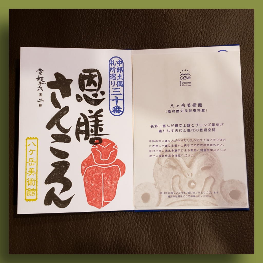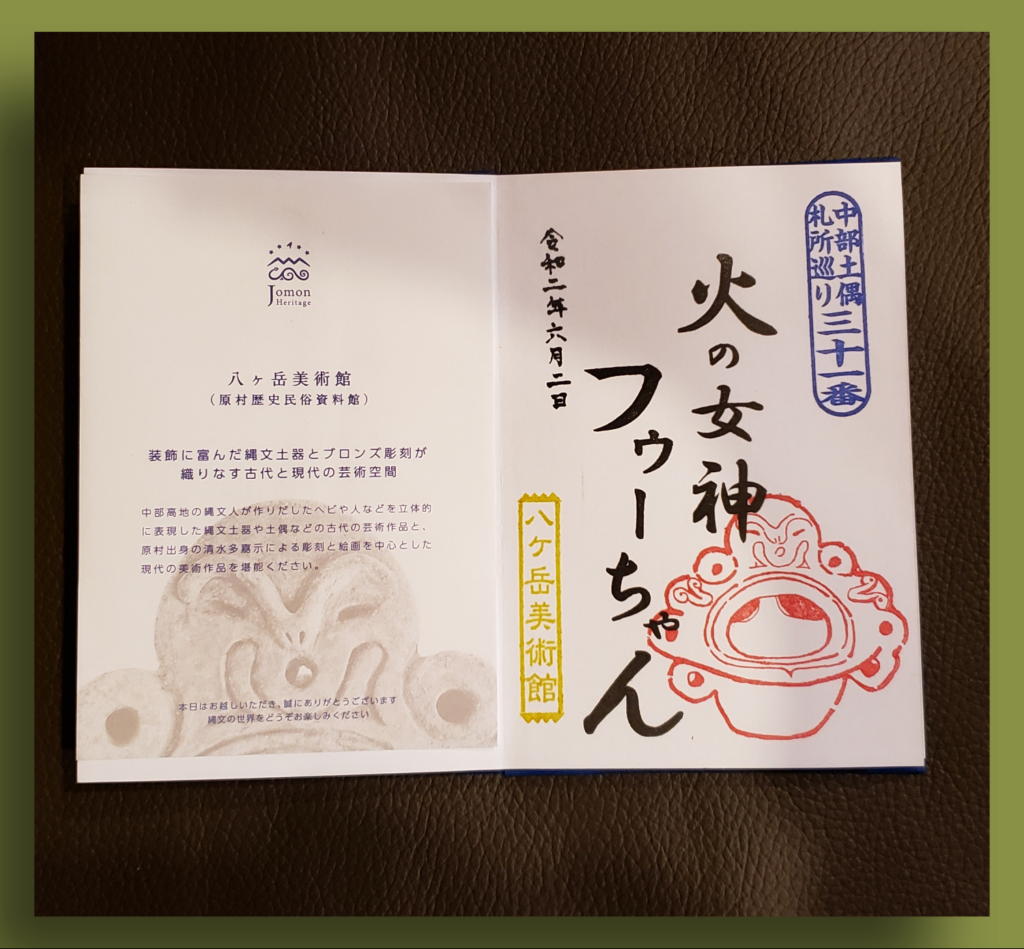 八ヶ岳美術館は、尖石や井戸尻より1日早く、6月1日から展示再開していたので、さすがに「巡礼&ご朱印 第1号」は無理だろうなと諦めていた。が、女性の職員さん(学芸員さんかな?)から、すぐに「あっ、ご朱印ですか?初めてで~す。ありがとうございま~す。」というリアクションがあった。やったね\(^o^)/