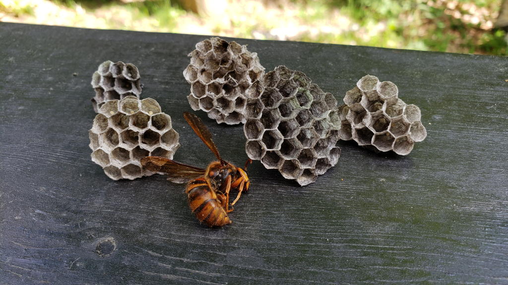 トリグラフ・リサーチ領土内に侵攻してくると、どんな報復攻撃が待ち受けているかを知らせるために、スズメバチの死骸と巣を並べて放置。蜂はこんなの見ても何も感じないだろうが、蟻が運んで処理してくれるだろう…