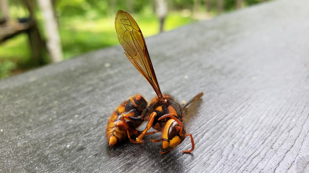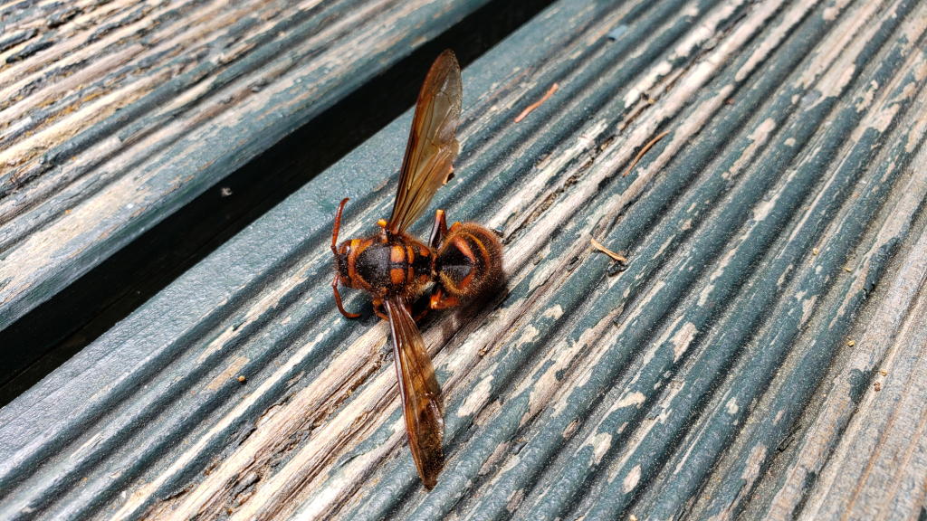 パッと見は「キイロスズメバチ」、もしかすると「女王蜂」じゃないかな? 女王蜂か働き蜂かはさて置き、早期に駆除できたのは大きな戦果だ!