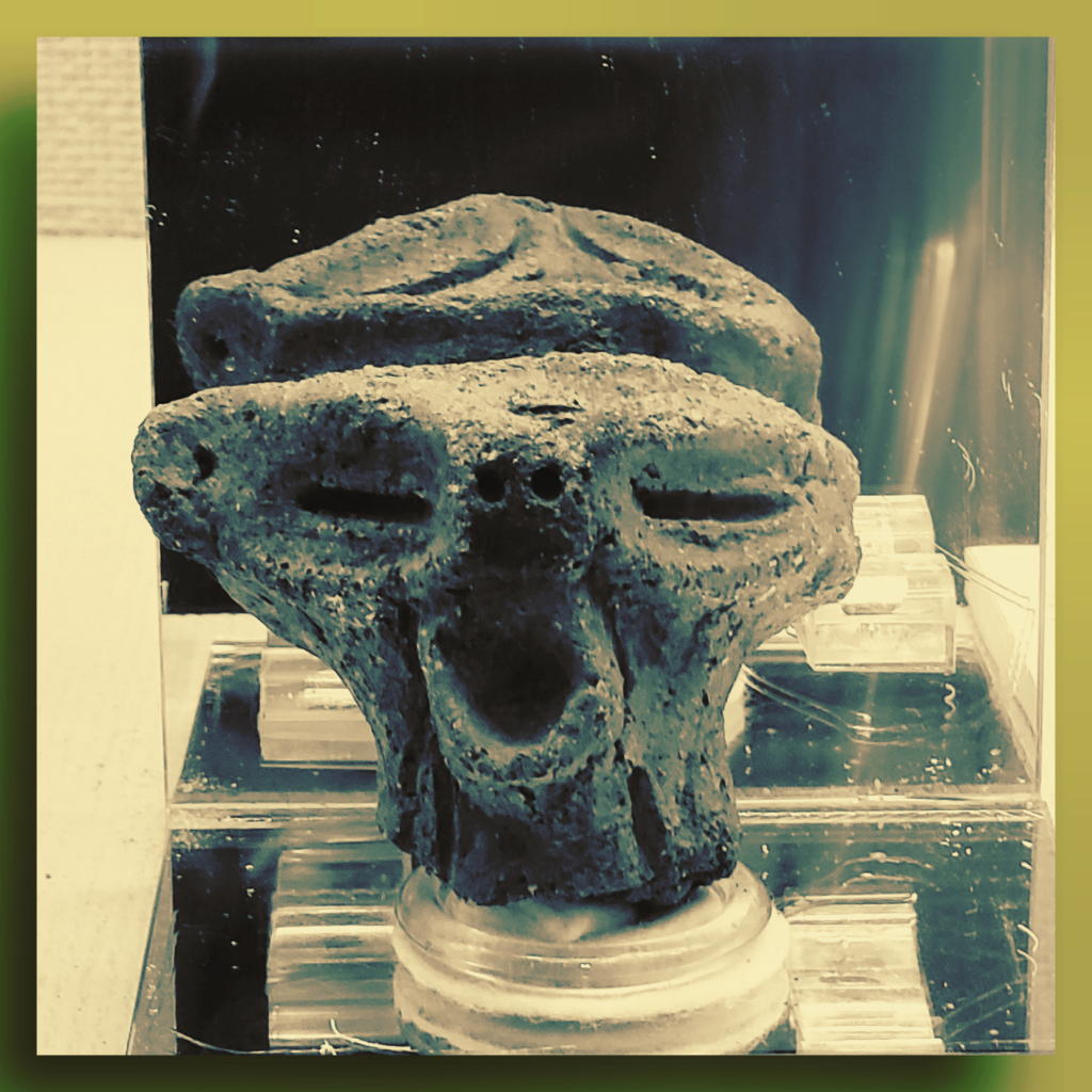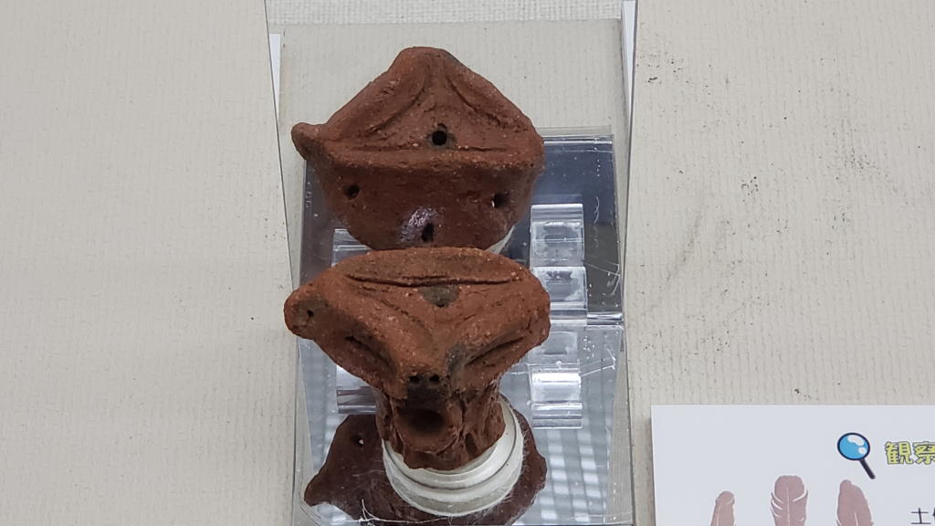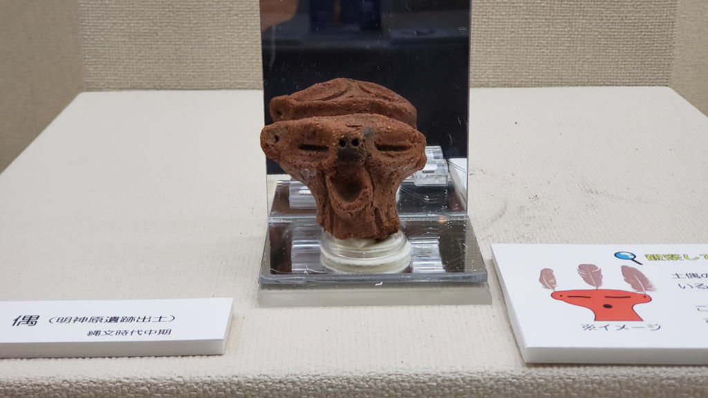 まずは「明神原の土偶」さんにご対面。ふ~ん、お顔はちょっと怖い系だけど、頭部に羽飾り用の穴が開いている。実は「お洒落系」さんなんだ。