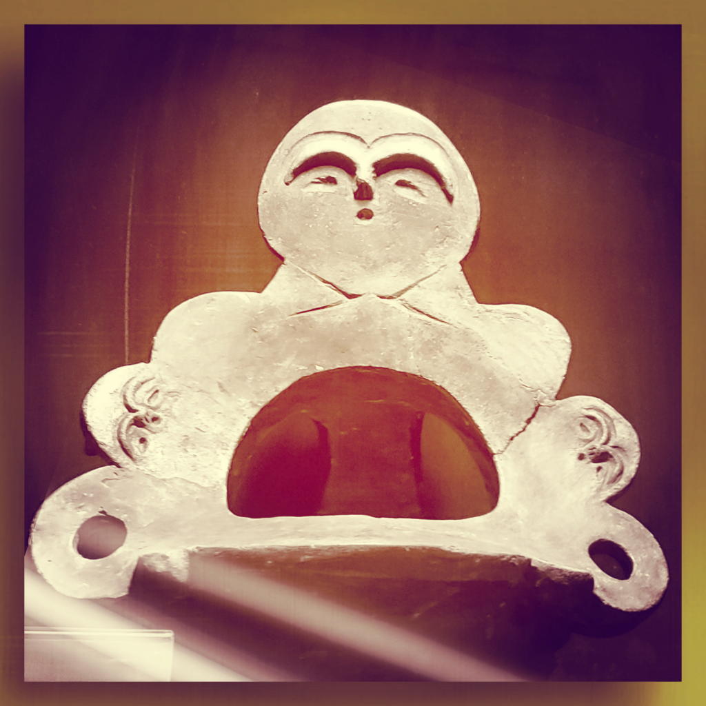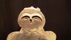 続いて、展示室奥の1段高いスペースにある「中道の香炉形土器」の鑑賞に移った。にっこりと微笑む人面付きの愛らしい造形の人面付土器である。