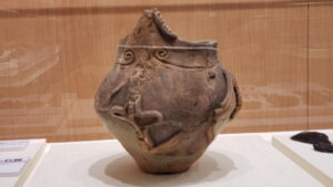 1Fの「黒曜石採掘抗ジオラマ」を見学した後に、2Fの下諏訪町の遺跡展示室に向かった。こちらには33番「殿村遺跡 人体紋付壺」が展示されている。が、ご朱印帳付属のイラスト図では、その特徴がよくわからなかった。