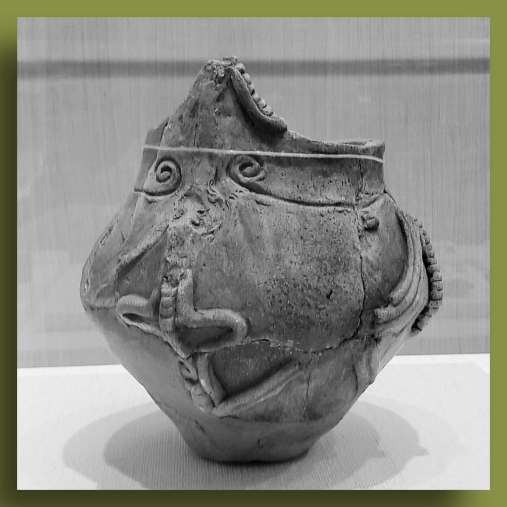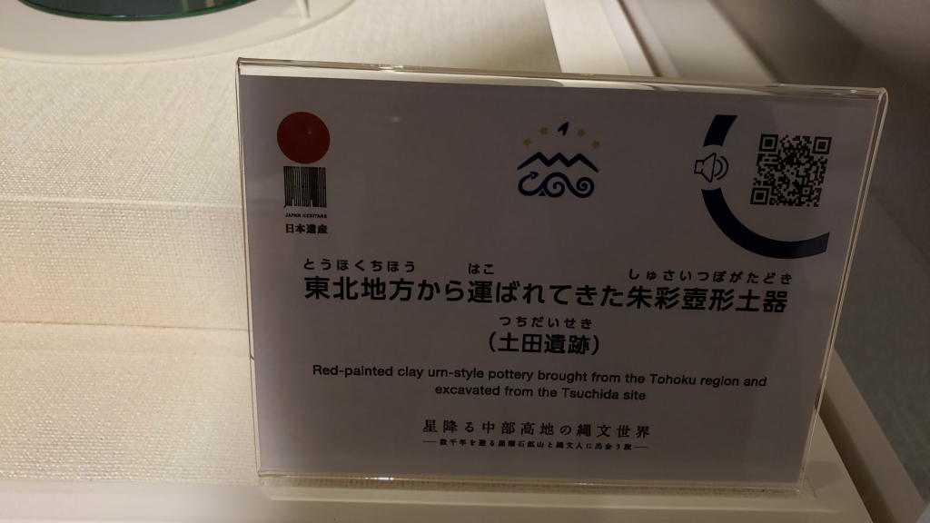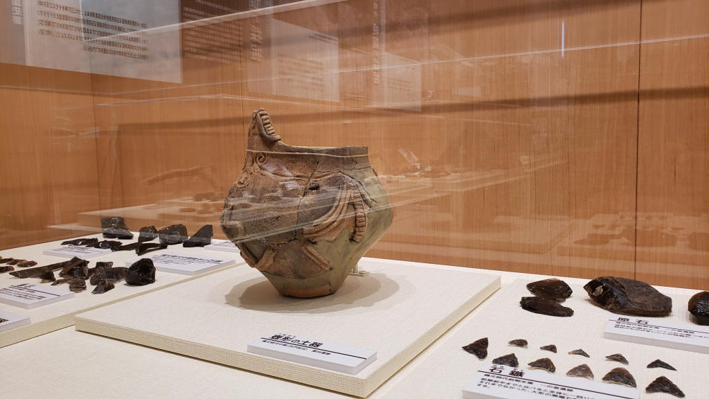 「あっ、これだ!」ごく普通に黒曜石の石器と一緒に並べられている土器が33番「殿村遺跡 人体紋付壺」だったのである。