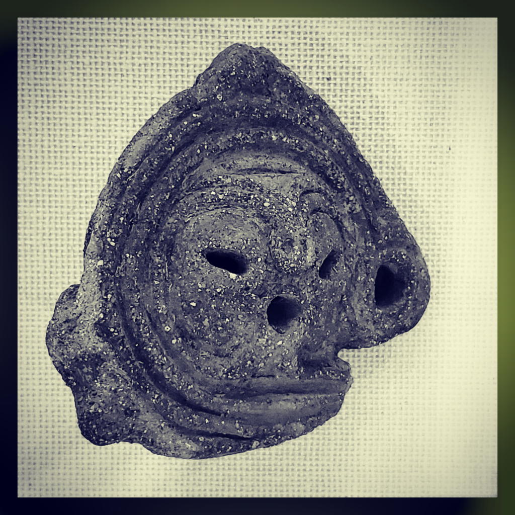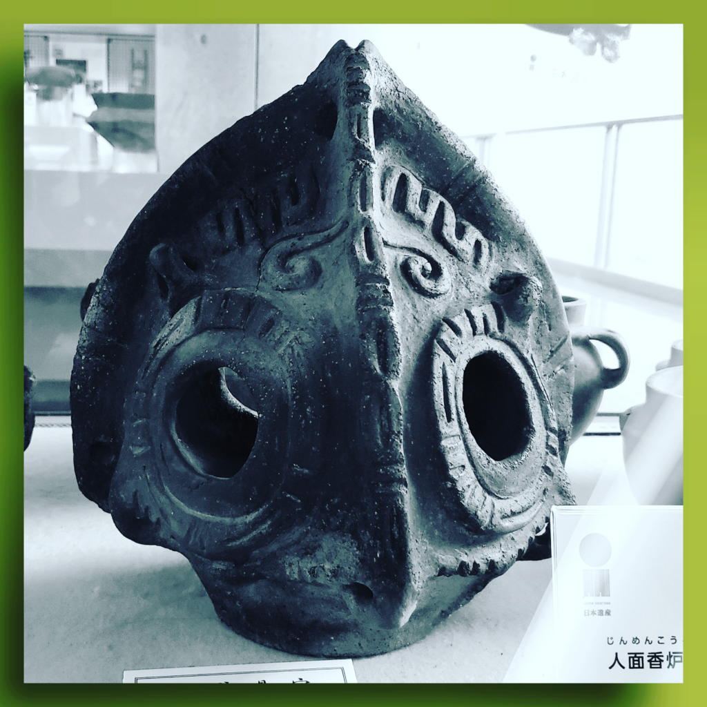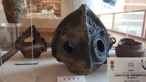 男性職員さんは、事務室を出て別の部屋に移動。その際に、展示は2Fですと階段を案内してくれた。こちらの札所指定は、24番「24仮面装飾香炉形土器」と25番「大深山遺跡出土顔面把手」。三十三番土偶札所巡り案内マップのイラストで、24番の方は前々からご対面したかったが展示場所不明で願いが叶わなかった「仮面土器」であるように思えた。だが、25番については、これまで見た事も聞いた事もない。色々な意味で期待感が高まった。