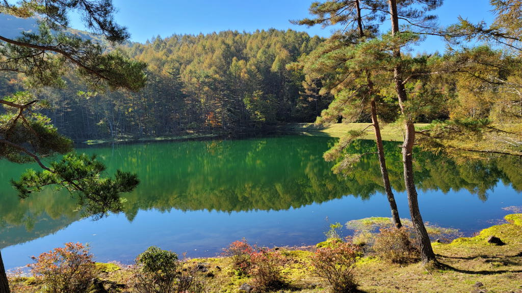 10月21日に社主さまと「御射鹿池」に行った際には、まだ紅葉の最盛期には早かったが、今日はどんな感じだろうか?