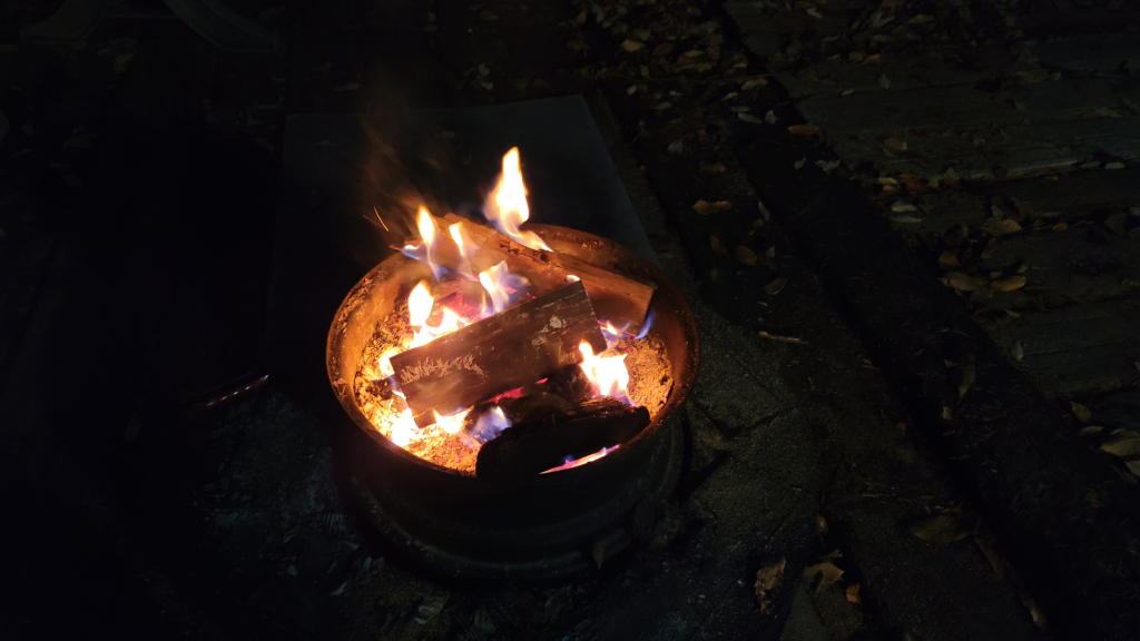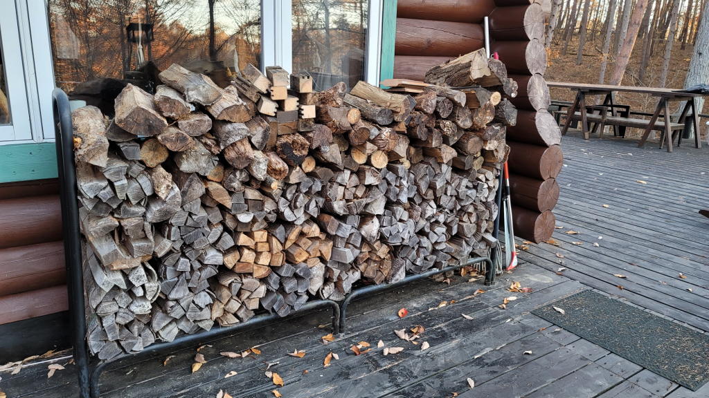 交換後には、電動丸のこ盤で焚き火用の木材カット。薪ストーブには広葉樹しか使わないが、焚き火にはウッドデッキの廃材やオフィスログキットの梱包材を小さくカットして使う(燃やす)。