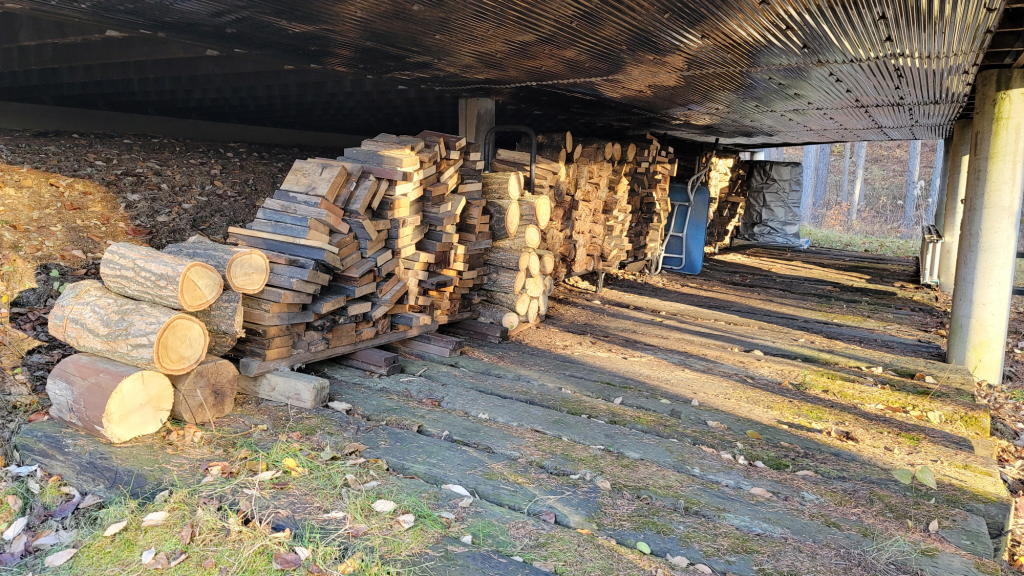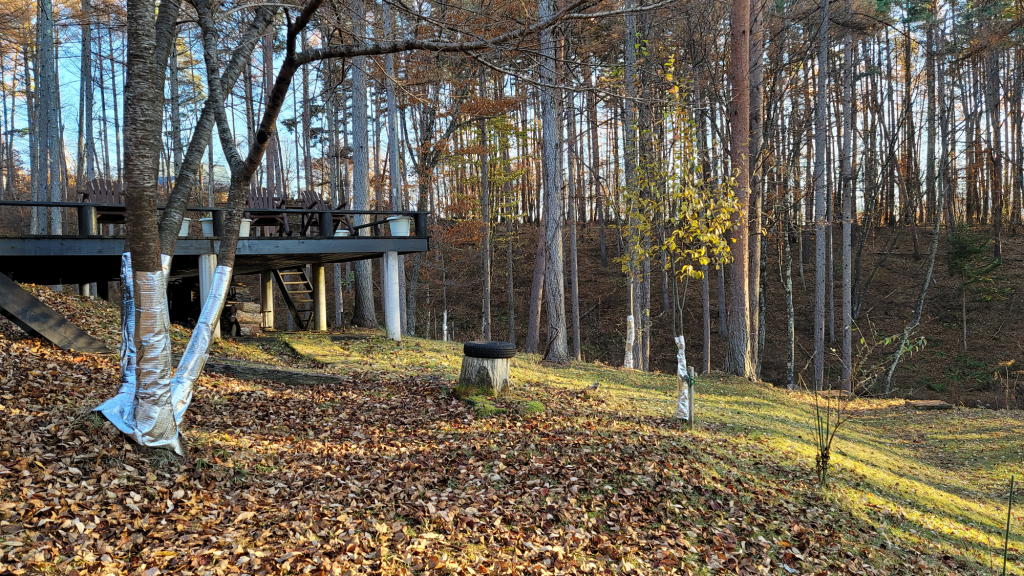 その後は、社主さまとひたすら薪のサイズへの切断作業。間に昼食(枕木テラスでのBBQ)を挟んで、メインウッドデッキ下の薪の貯蔵スペースへの運搬等々、冬支度を黙々と進めた。