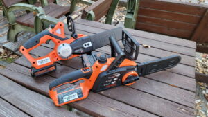結局「B&Dのコードレス・バッテリーチェンソーで行こう!社主さま用に購入した小型機のデビュー戦にもちょうど良いな。」と判断し、オフィス地下室から2台のチェンソーを運び出して作業を開始。