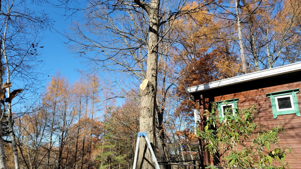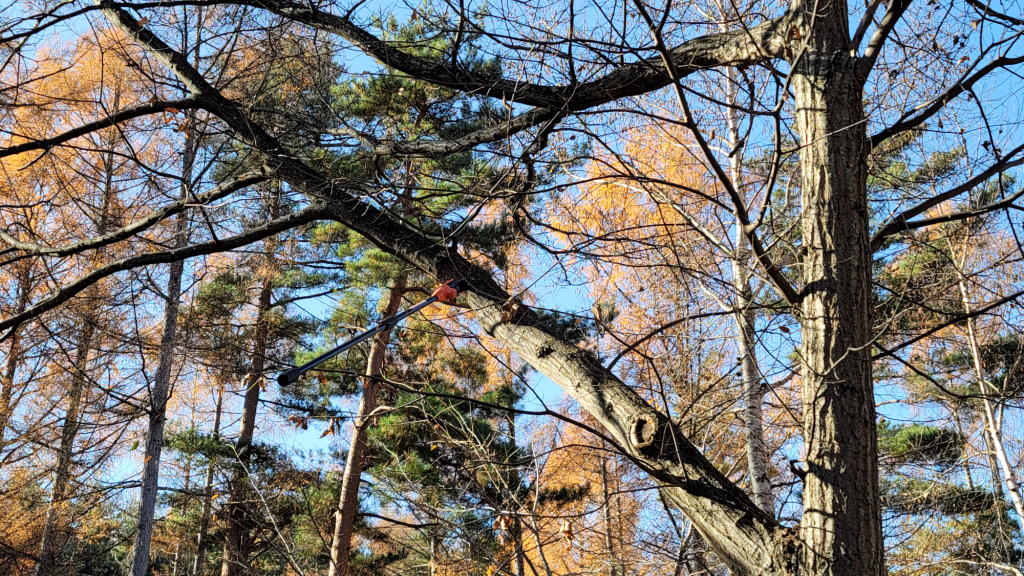 加えて、いざ作業を始めて見ると思ったより枝がかなり太かった。悪戦苦闘する事約80分。太く大きな枝を枕木テラスの上に切り落として、無事にポールチェンソーを救出できたのは11時少し前。