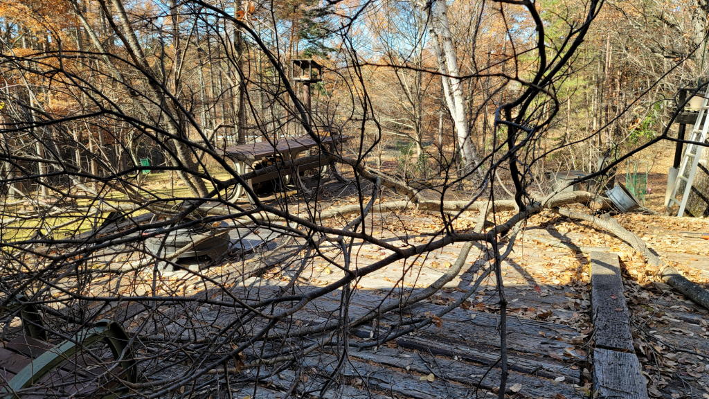 枝のボリュームは予想以上で、枕木テラスの半分近くが覆われてしまった。こんなに大きな枝を落としたのは21年目を迎えた八ヶ岳ライフで初めての経験だ!