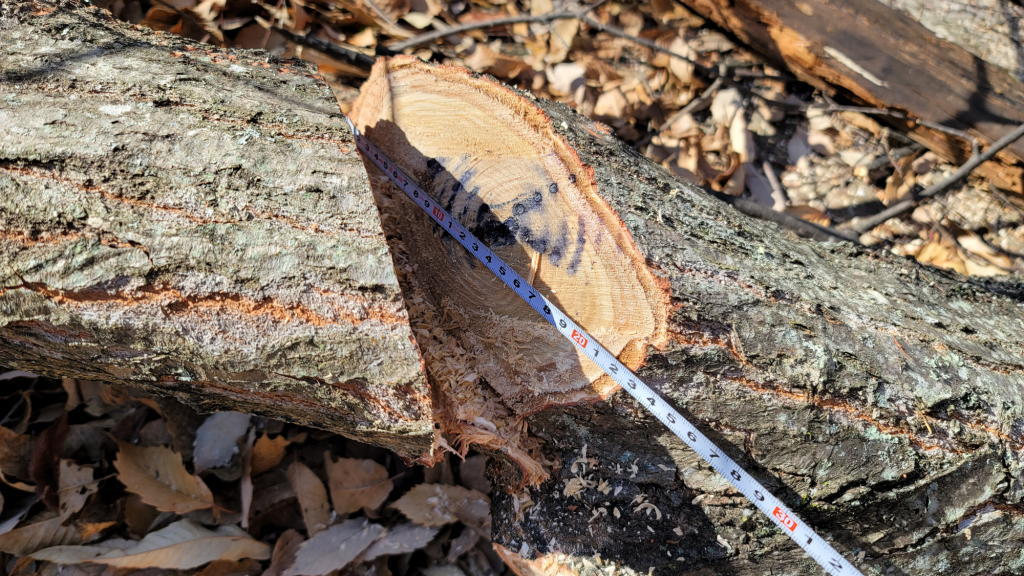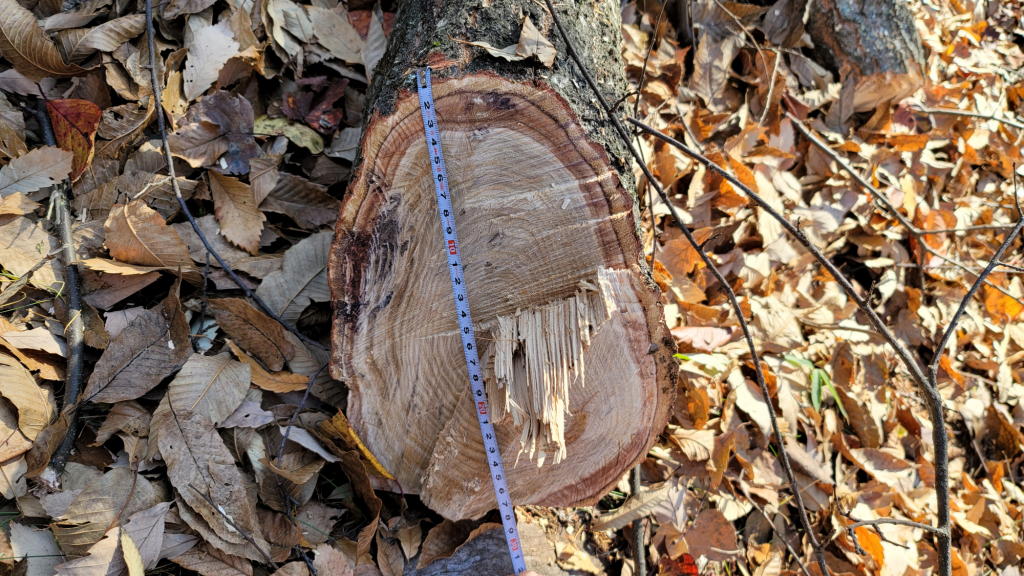 改めて切断した枝の最長部を計測すると、ポールチェンソーが挟まれた枝が23cm、幹から切断した部分が28cmだった。両方共、チェンソーの切断可能な直径を超えていた。チェンソーに無理させちゃったな…