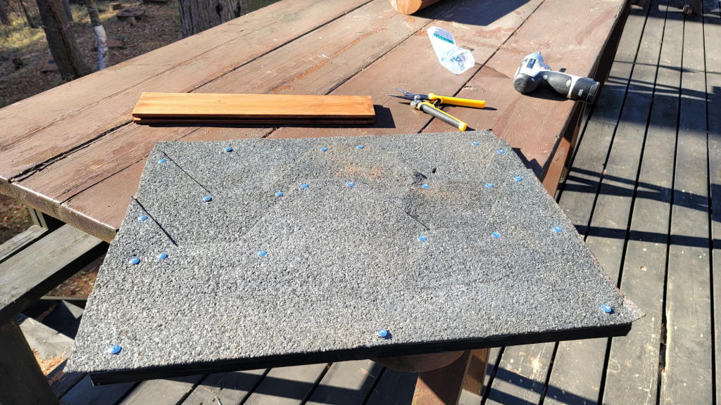 4日(2日目)は、屋根施工⇒給餌皿取り付け穴開け加工⇒支柱(土台)のカットと固定⇒一部部材のボンドによる固定を行った。