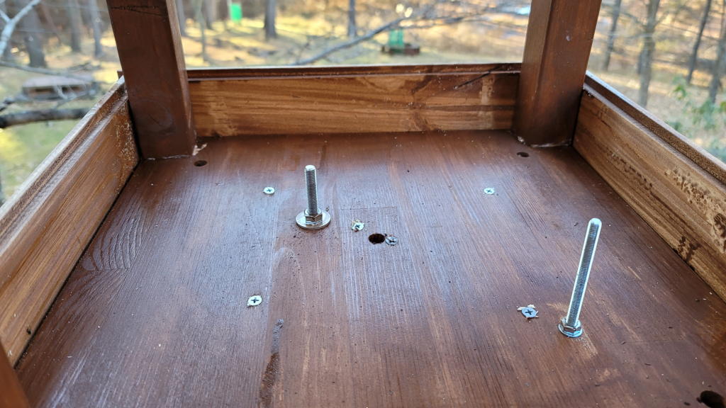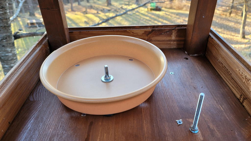 今回の新1号店は大型なので、ヒマワリの種用の他に果物用の小さな皿を取り付ける事にした。そこで、簡単に取り外して掃除が出来るようにするためボルト支柱を2本設置。