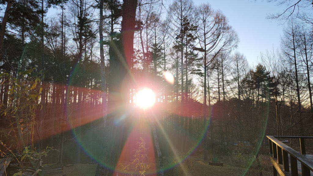 八ヶ岳では、ちょうど財産区林の樹間に沈む夕陽を眺めてホッとする時間帯だな。さあて次は「焚き火タイム」って感じだろう。