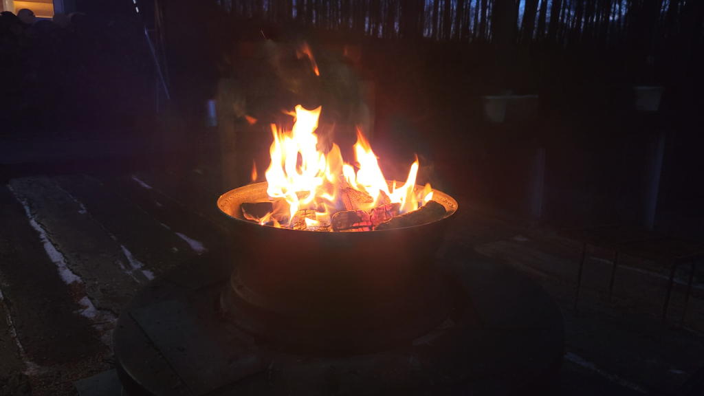 これから当分の間は、色々と「初」が付くことになる。夕方は枕木テラスで「2021年初焚き火」。