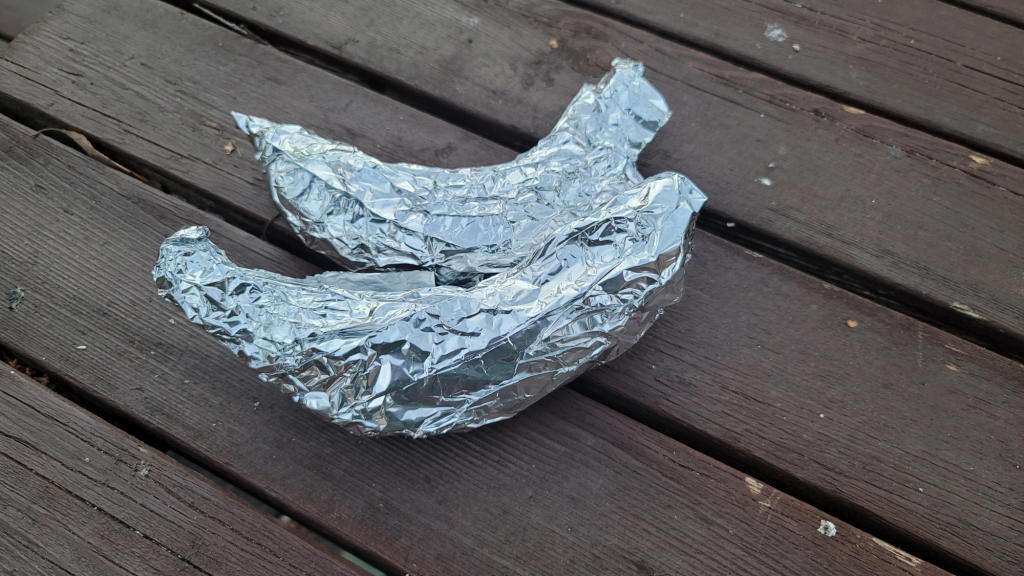 こんなの誰でも出来るだろうと高を括っていたのだが、焚き火の中でホイルが開いてしまったようで1本は「焦げバナナ」になってしまった。