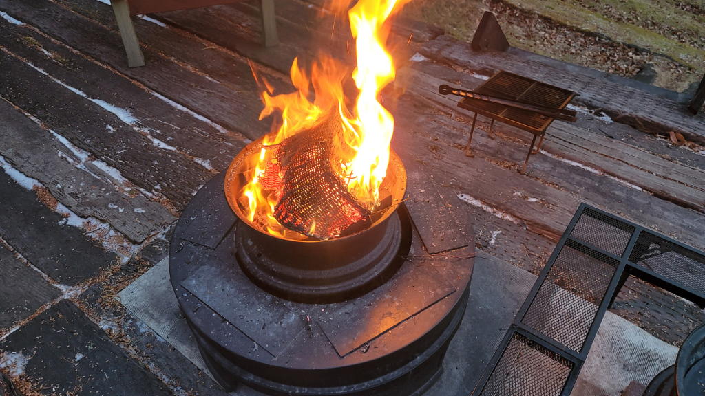 でも、お手製の枕木テラスの上で、これまたお手製の鉄チン製の焚き火台で毎日のように焚き火を楽しめるこばち~(私)は「希少種」に違いない。