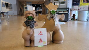 エントランスには、縄文のビーナスさまと仮面の女神さまの巨大レプリカが、マスクとマフラーを纏ってお出迎え。