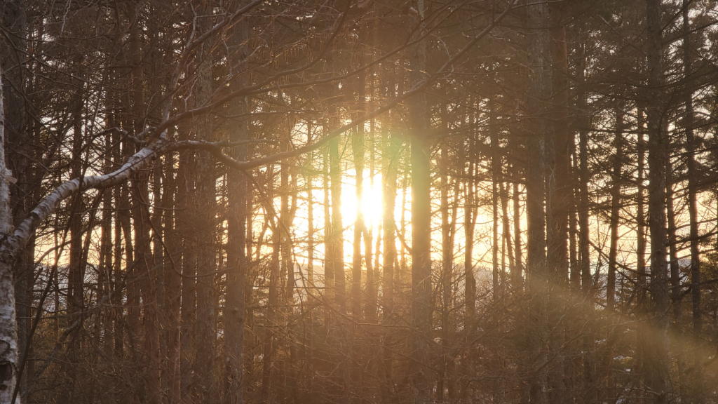 オフィスのウッドデッキに出て、財産区林の樹間越しに南アルプスの山々に沈もうとする夕陽を愛でた。