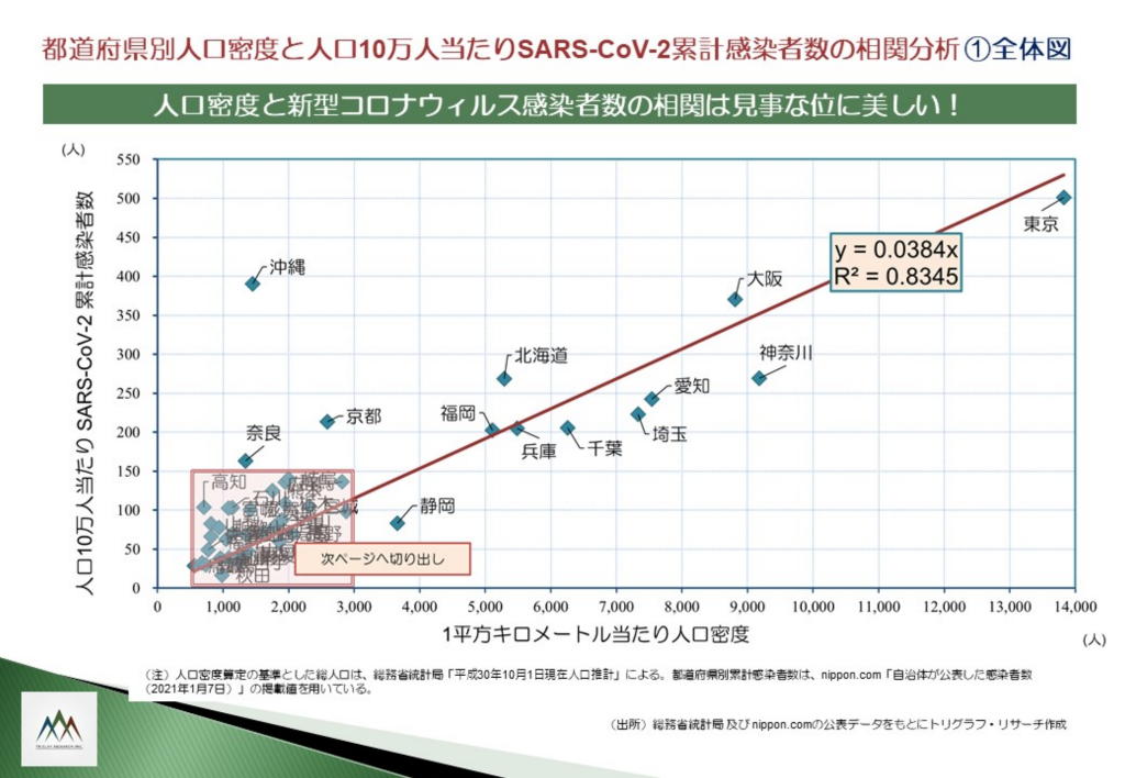 都道府県別の1平方キロメートル当たりの人口密度(X軸)と人口10万人当たりの累計感染者数(Y軸)の関係を表すシンプルな資料である。
