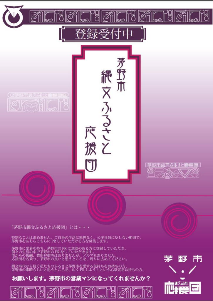 HPには「茅野市のイメージアップのため、『茅野市縄文ふるさと応援団』を設置しました。市民だけでなく、市外の方や法人など、意欲のある方に茅野市をPRする『営業マン』として活動いただきます。」と記されていた。