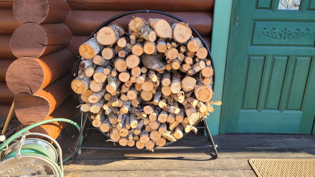 午後3時過ぎに枕木テラスに出たら、丸形のログホルダーが白樺の薪でギッシリ埋まっていた。