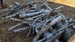 私が、庭をのんびりと敷地内を散策している間に、社主さまは薪になりそうな太さの枝を白樺の幹の上に大量に運んでいた。