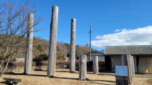 そして、中ッ原縄文公園の最大のポイントは、ジオラマ展示施設の脇に建つ8本の柱である。
