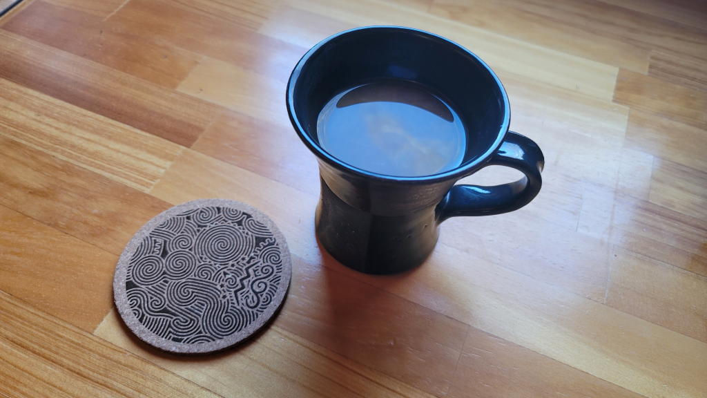 傍らには、三十三番土偶札所巡り結願でゲットして、すっかりお気に入りとなった「縄文」が描かれたコースターがある。