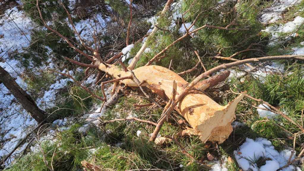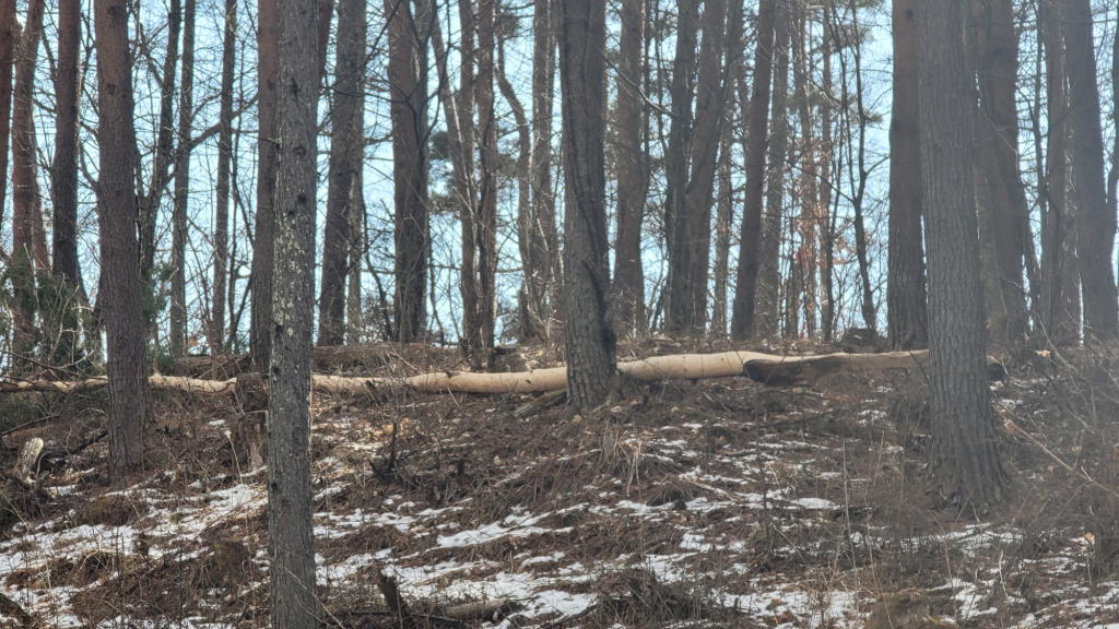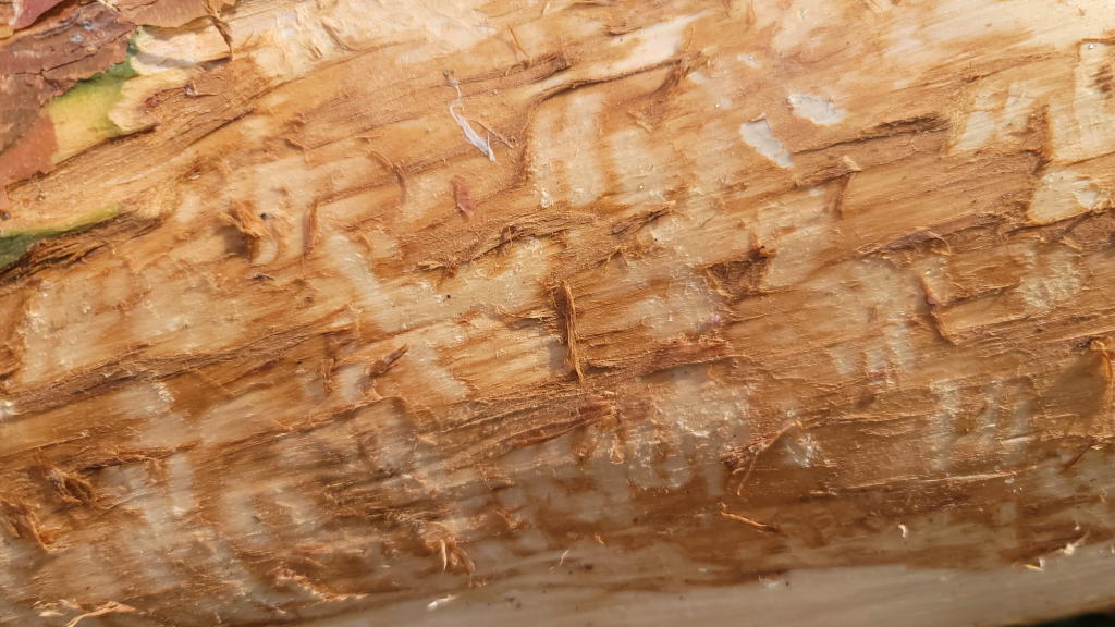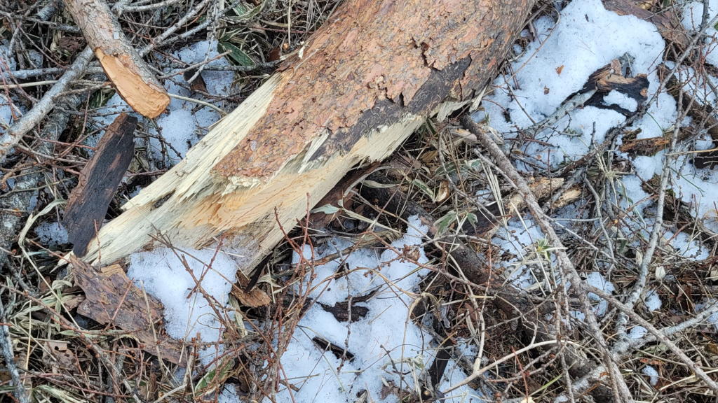 財産区林内には、樹高20mはあろうかという赤松の風倒木があるのだが、その木の幹も、見事に美しくピーリングされていた。