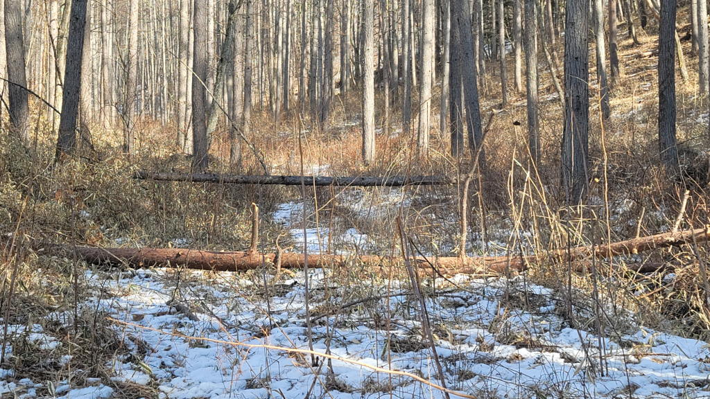 財産区林内の涸れ沢に沿って少し歩いた。私の行く手を阻むように大きな風倒木が2本。