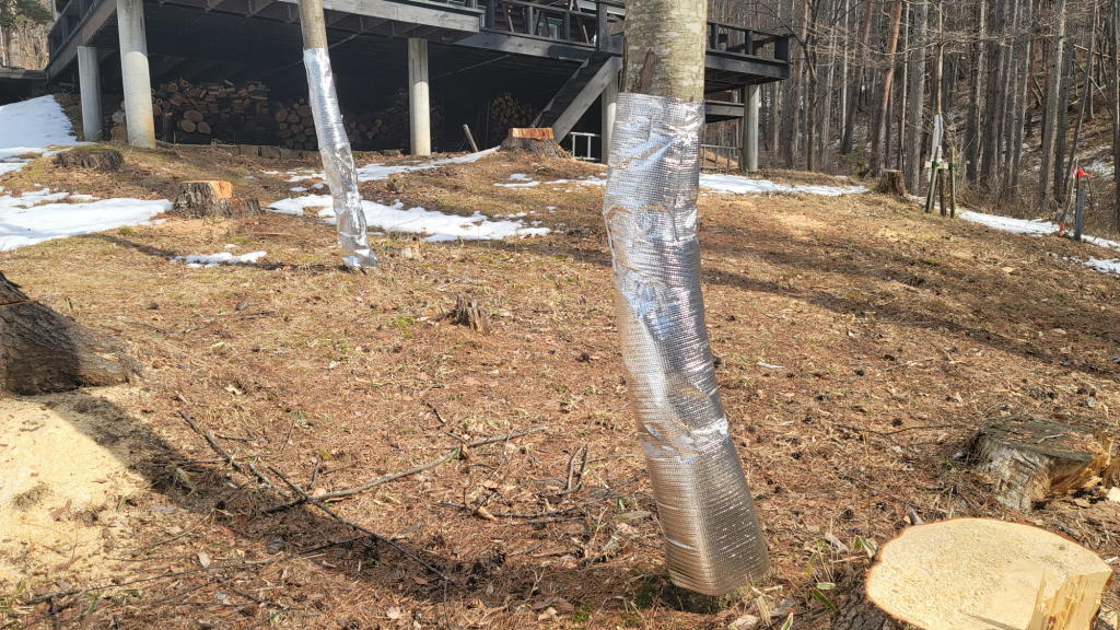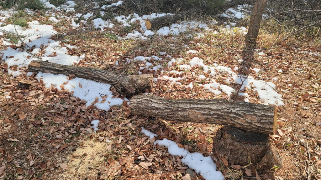 敷地内の財産区林との境界付近には、1月20日に伐採した赤松や唐松の幹の一部や枝が積まれている。