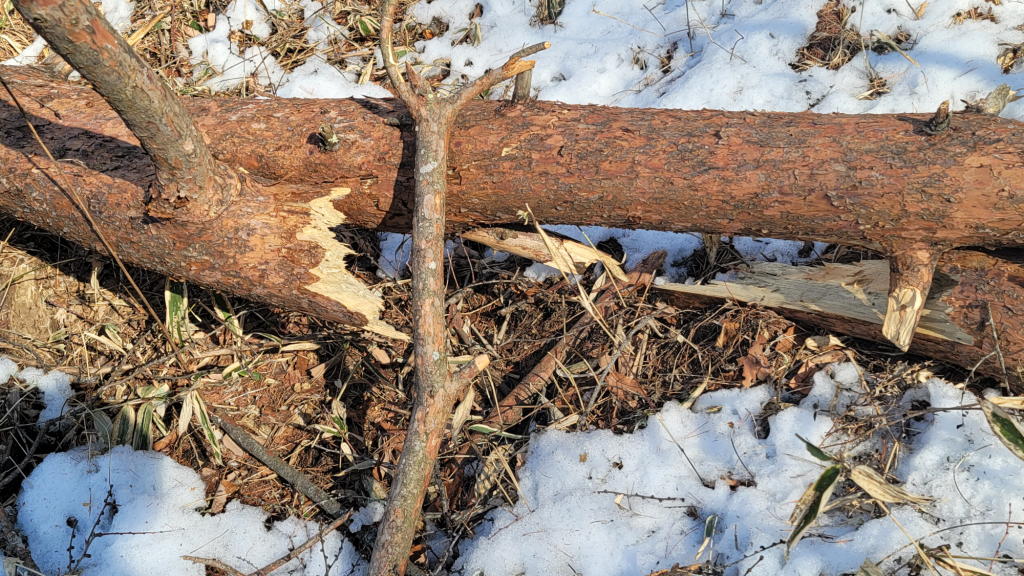 またもや赤松の風倒木を発見。こちらは完全には倒れずに、幹の途中で唐松の枝に引っ掛かっている。