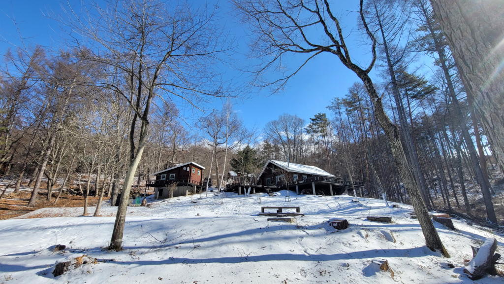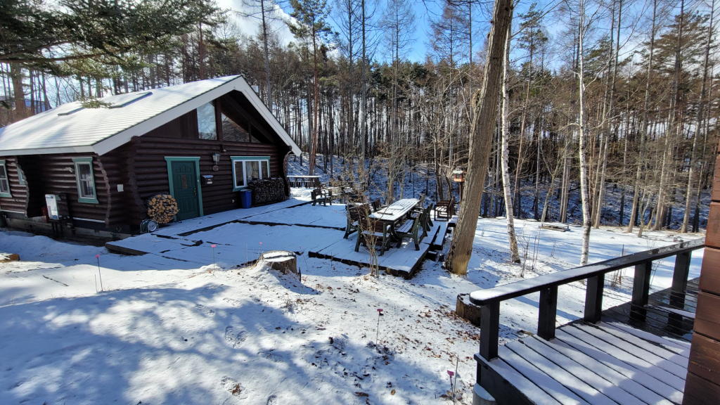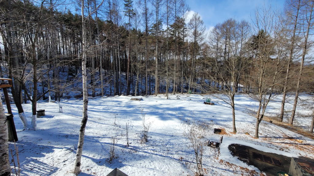 昨日夕方には、ほぼ解けて消えていた雪が敷地内を覆っているではないか? しかも空は、見事な位に清々しい「八ヶ岳ブルー」。