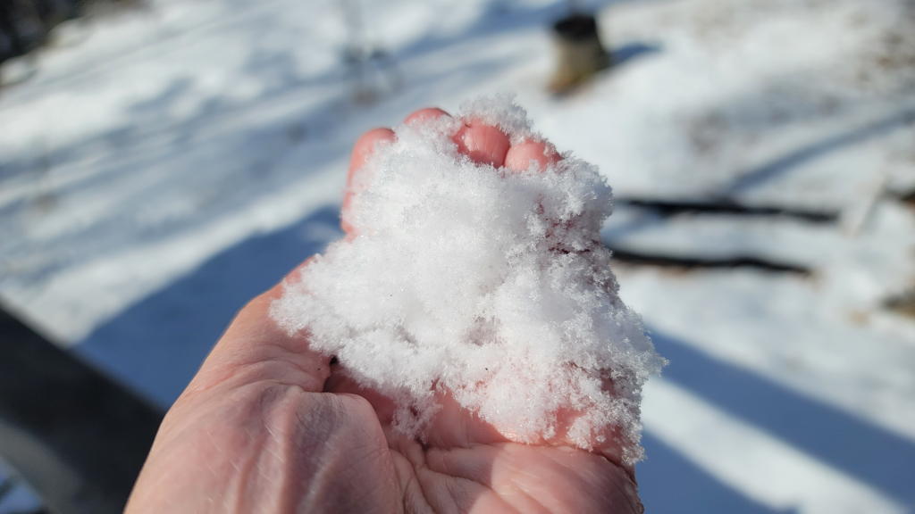 積雪量は7~8mmって感じだろうか。寒さは感じないので、この陽射しの強さなら昼過ぎにはほとんど解けてしまうだろう。