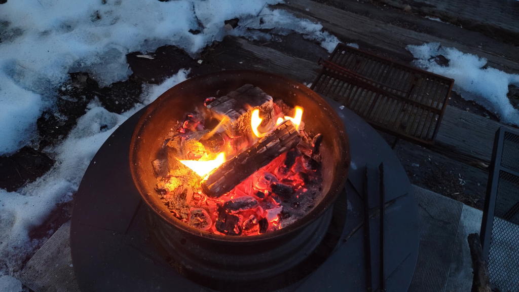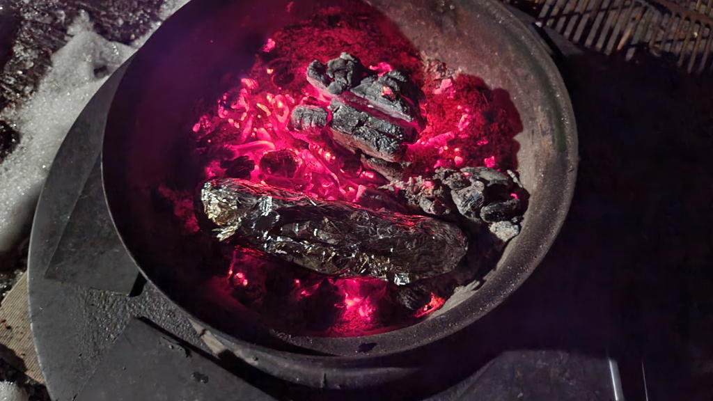 サツマイモの片面が熾火に接した状態にして、太目のサツマイモのなら20~30分程焼く(Google嬢で25分にタイマーセット)。