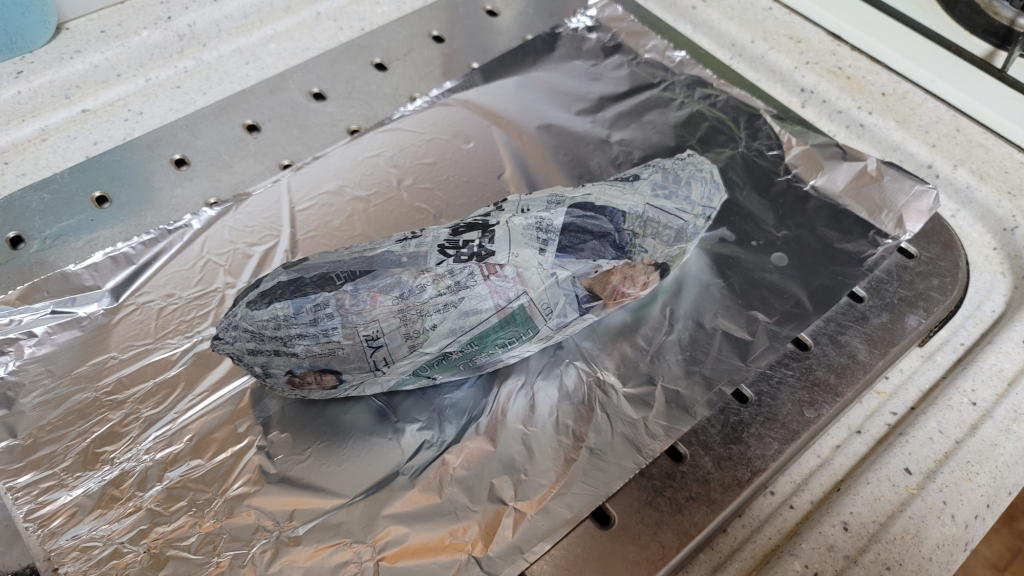 続いて、新聞紙に包まれたサツマイモを、アルミホイルでしっかりと包む(フムフム)。