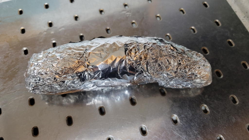 串がスッと通るようなら、サツマイモの中心にも火が通っている(スッと通るって感じがわからん。取り敢えず片面5分ずつ焼き時間延長!)。