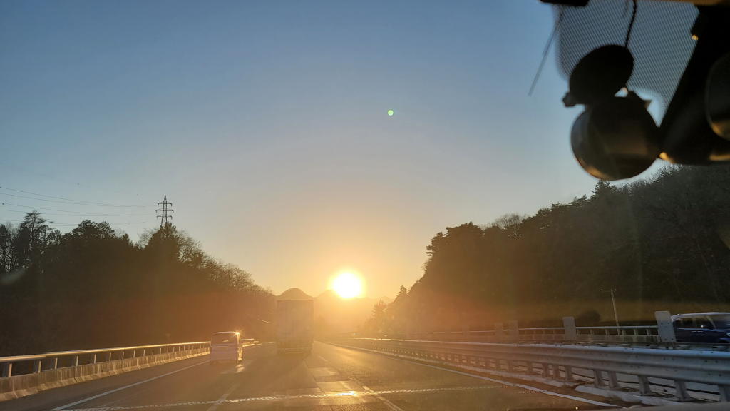 中央道をちょうど夕陽が沈むタイミングで走行。太陽の大きさにちょっと驚く。太陽、最近、膨張してないか?