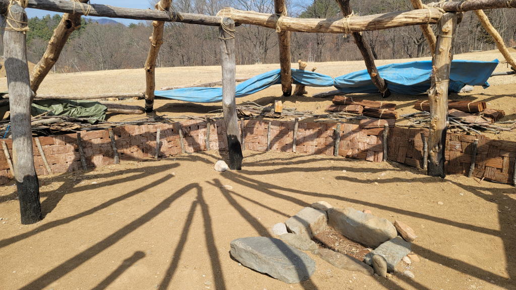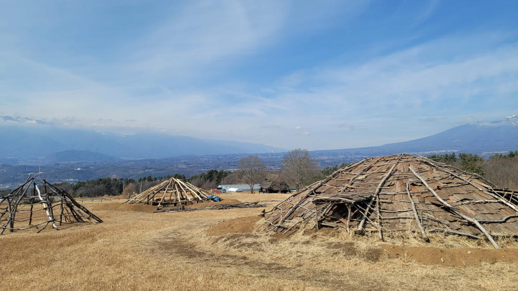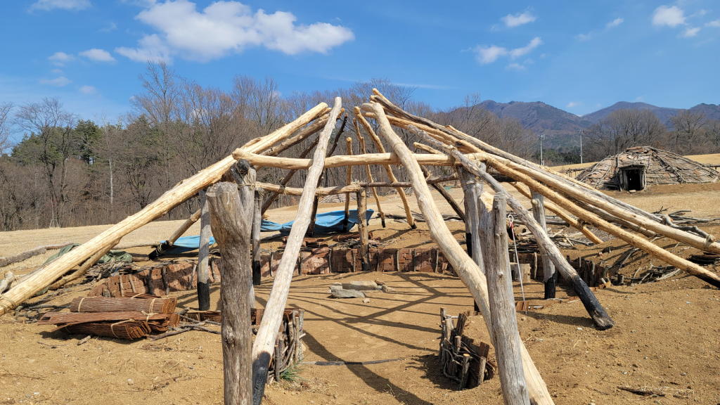 開放感抜群の景色が素晴らしいのはいつも通りだった。だが今日は別のポイントに目が釘付けになった。建築(復元)中の「竪穴式住居」があったのだ!