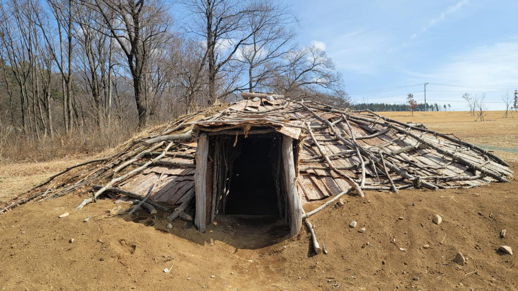 「梅之木遺跡」の竪穴式復元住居は、他の縄文遺跡とは趣が異なる。芦や茅などで葺いた屋根ではなく、土葺き屋根で地面と一体化したような構造なのだ。