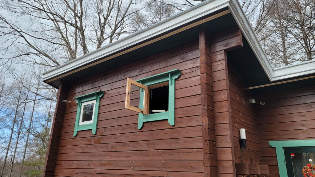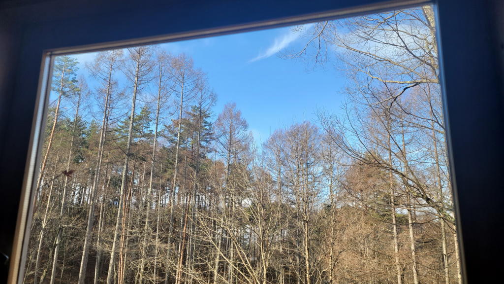 昨日とは打って変わって、今日の八ヶ岳は朝から快晴。オフィスの窓からは八ヶ岳ブルーの空と財産区林の木々が見える。